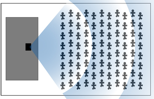 Place your sound system approximately 10 feet from the first row of the audience and in the center of the room or field, see below illustration. The speaker should be at the head-height when facing the audience. If you are using a companion speaker to cover a large crowd, place the speakers on either side of the stage or presentation area for the best distribution.